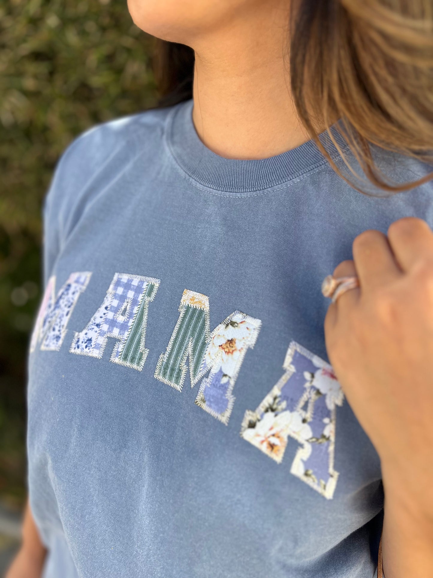Meet your new favorite mama tee. This Comfort Colors shirt features our custom patchwork applique design that spells out MAMA in the prettiest mix of florals, ginghams, and stripes. Each letter is carefully stitched onto our soft lived-in ees, giving you a one-of-a-kind piece made just for you. Whether you're running errands, grabbing coffee, or snuggling your babies at home, this tee is the perfect blend of comfy and cute.