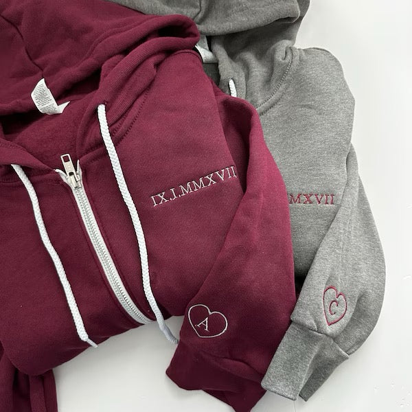 This zip up hoodie features your custom date in embroidered roman numerals on the chest and a heart initial detail on the sleeve.