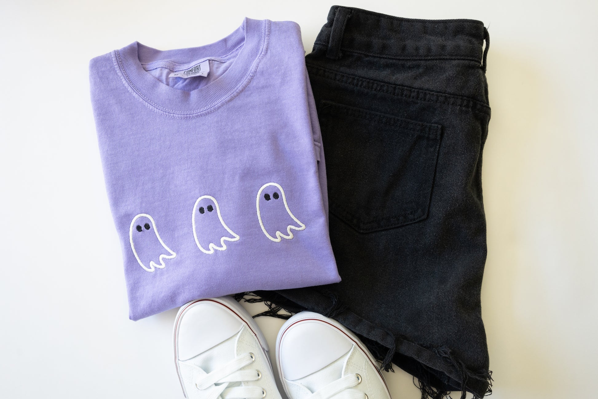 Sweet and spooky 👻 This lavender Comfort Colors tee features three little embroidered ghosts lined up across the chest, minimal, festive, and perfect for spooky season.