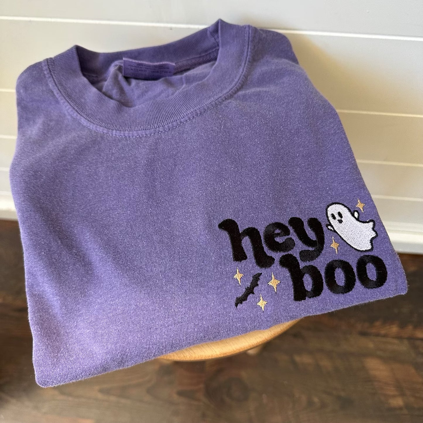 Say hey to spooky season in style with our Hey Boo embroidered Comfort Colors tee! This soft, pigment dyed tee features an adorable ghost, a little bat, and sparkly stars perfectly stitched for that cute + spooky vibe.
