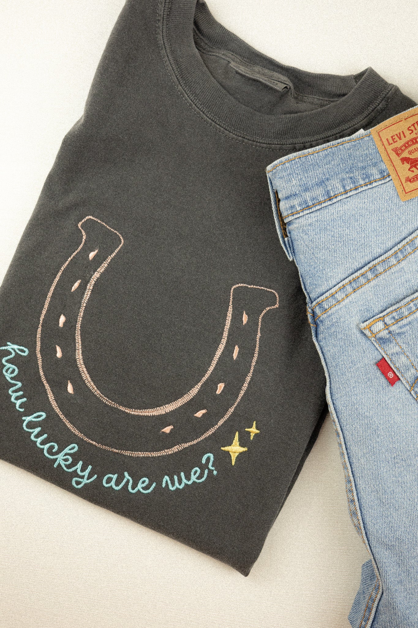 Featuring a simple yet sweet “how lucky are we” embroidery on our favorite Comfort Colors tee. The perfect reminder to stay grateful and grounded, and it looks super cute with biker shorts or jeans. Made in house at our CA warehouse just for you.