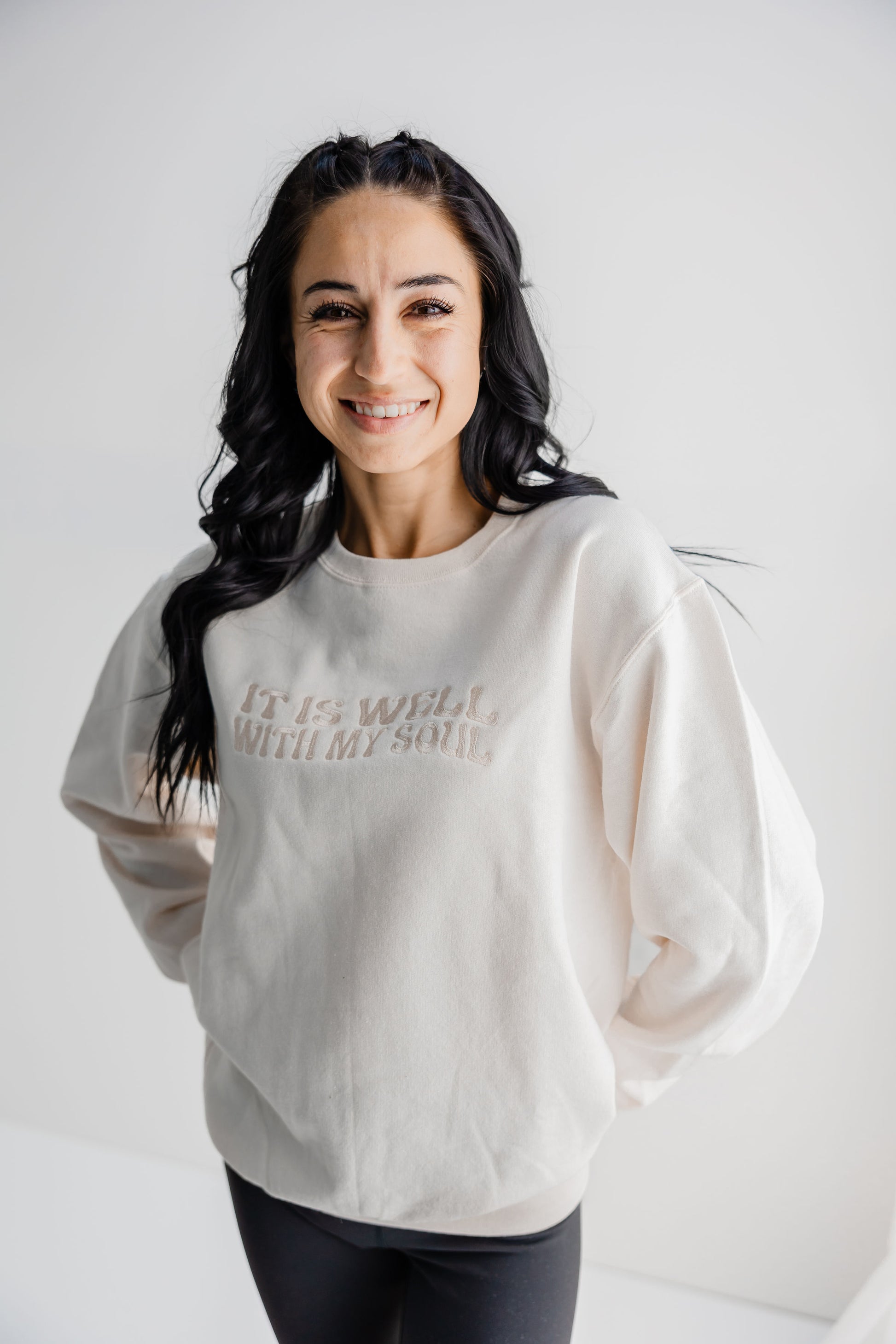 Soft, subtle, and full of meaning. This cozy sweatshirt features “It Is Well With My Soul” embroidered across the front of a cozy crew! Opt for a monochromatic tone gives it for a minimal look!