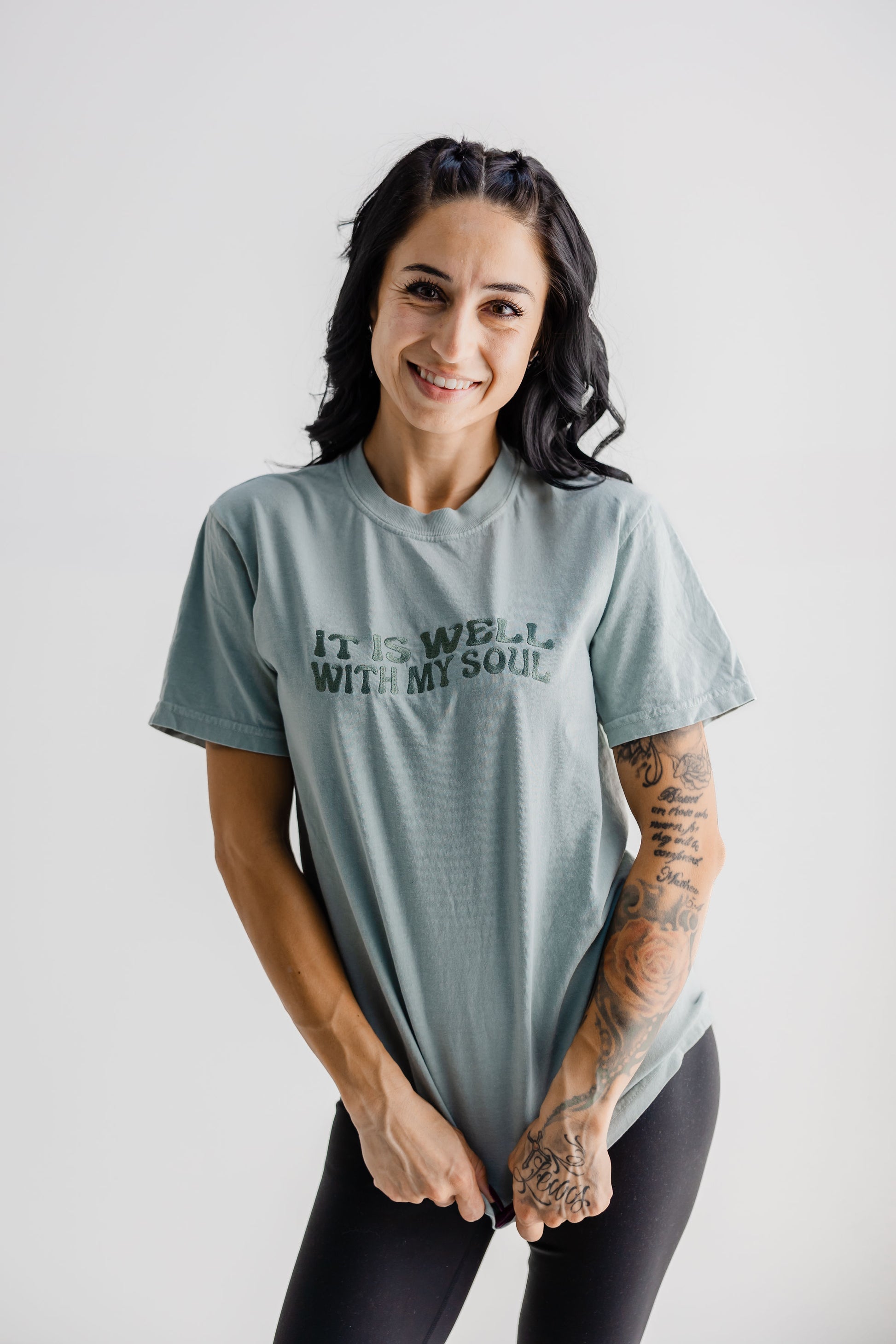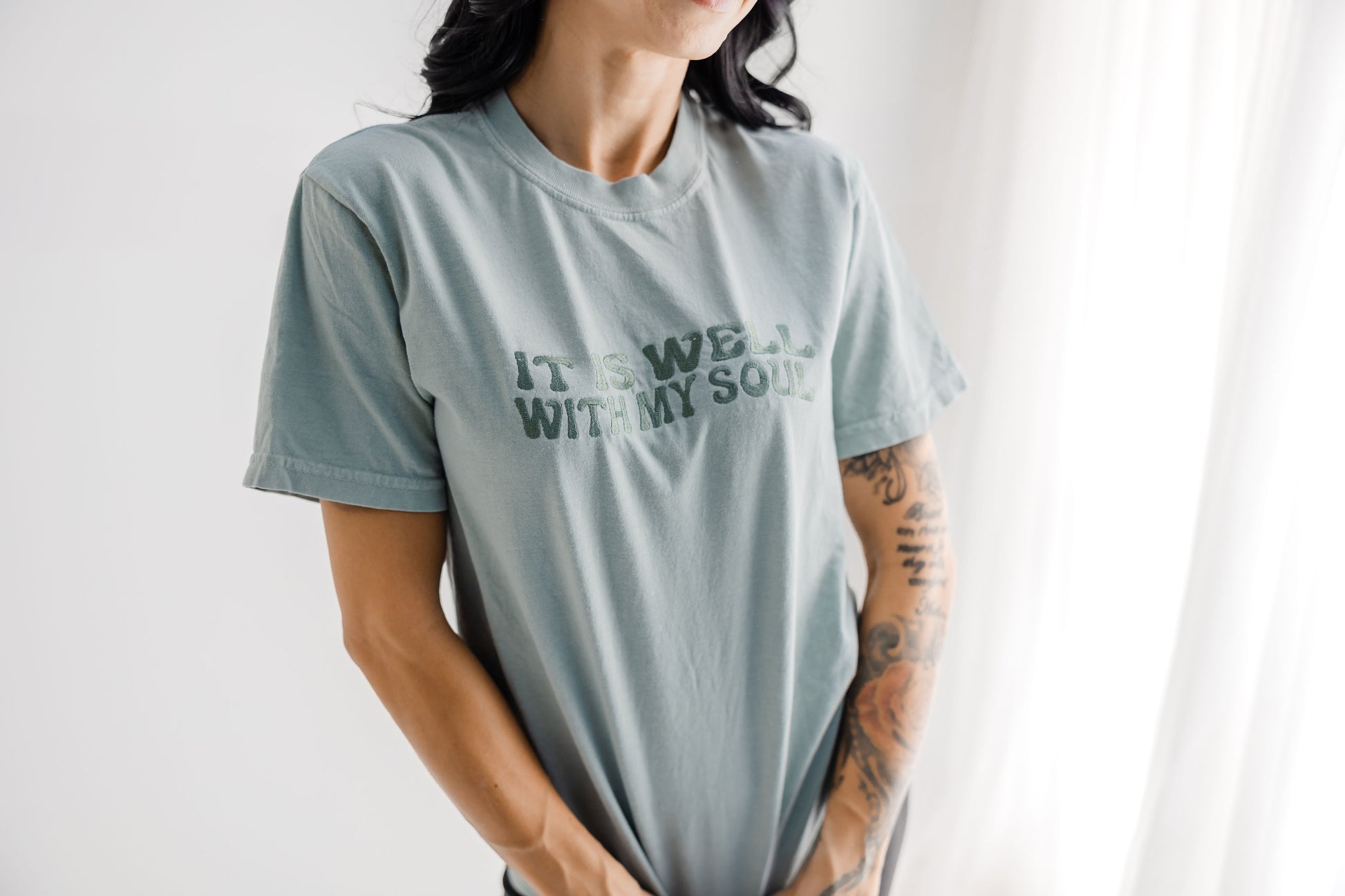 This one speaks peace! Our “It Is Well With My Soul” design is fully embroidered across the front on Comfort Colors tee. The tone on tone stitching gives it a clean, classic look while still making a statement. It’s a calming favorite and makes such a meaningful gift, too!
