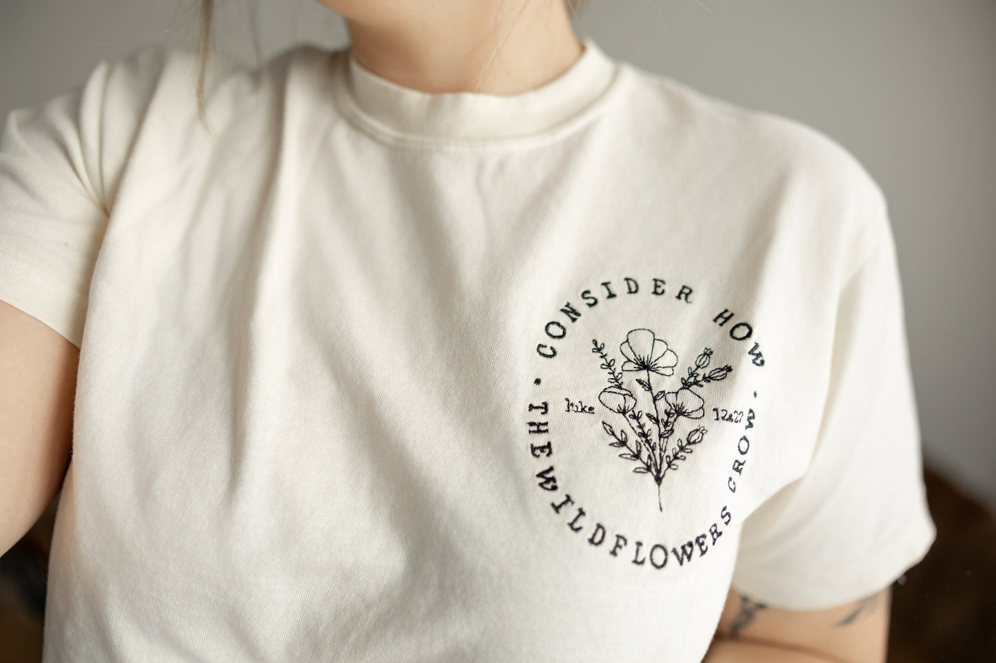 A soft statement with a deeper meaning. This Comfort Colors tee features our embroidered 'Consider how the wildflowers grow' design inspired by Luke 12:27, paired with delicate florals that make it feel peaceful and intentional.