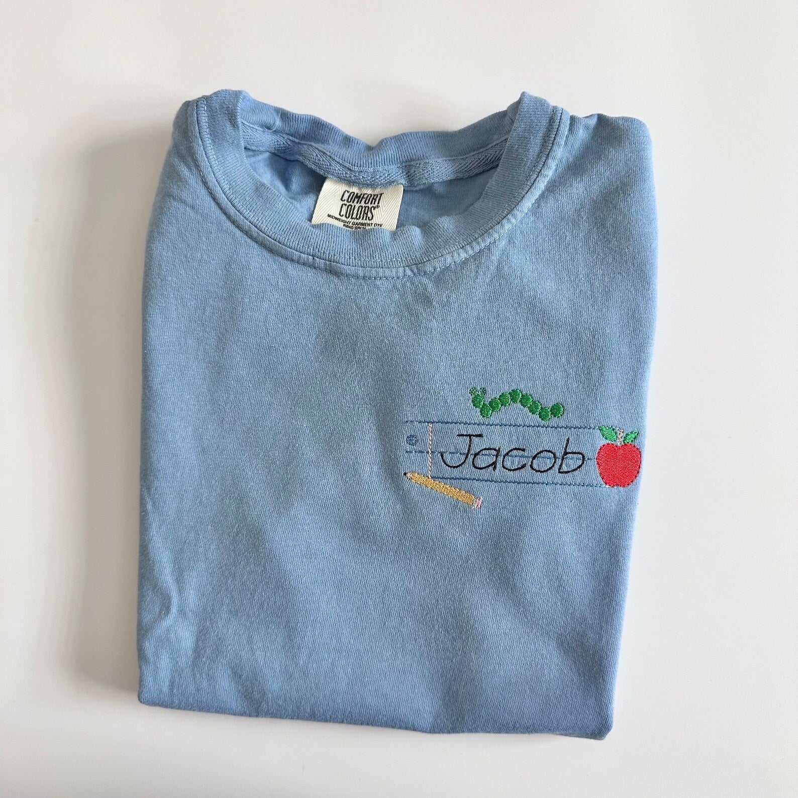 Ready to roll into a brand new school year ✏️🍎🐛 This adorable personalized tee is perfect for your little learner’s first day back! Their name, an apple, pencil, and a friendly inchworm, all stitched with love to make them feel extra special!
