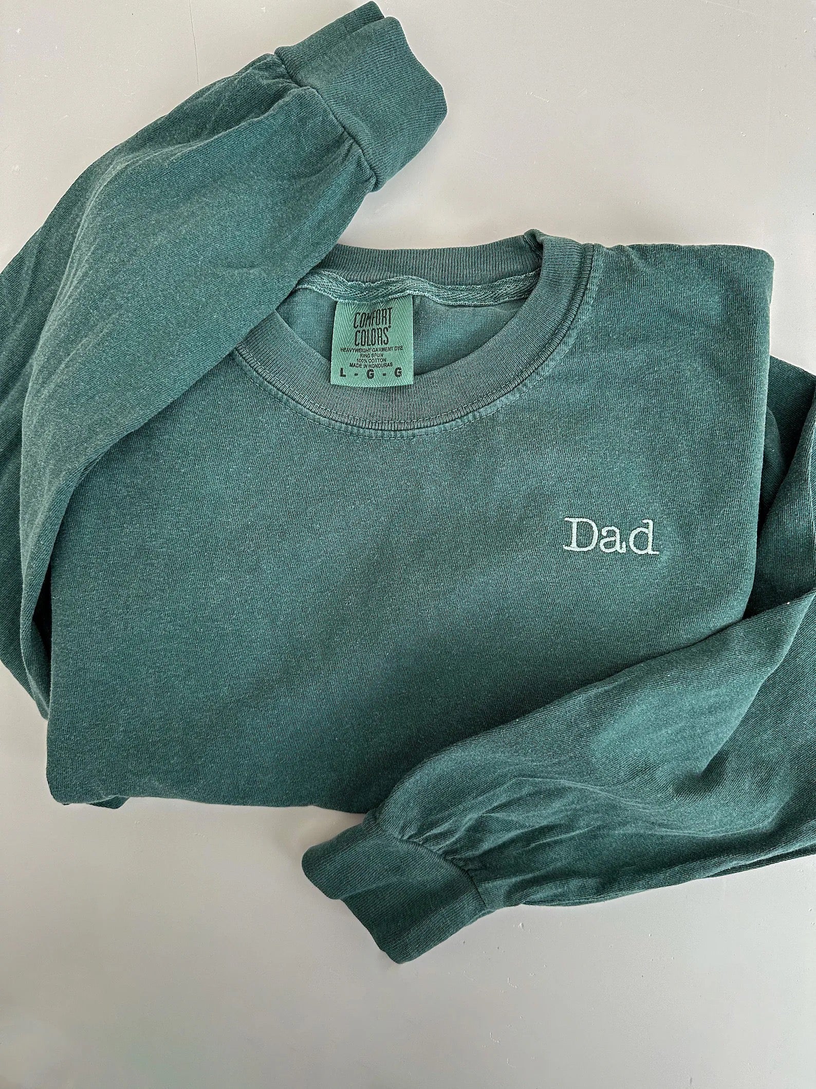 A clean and classic embroidered tee for all the cool dads out there. This Comfort Colors crewneck long sleeve features your custom text on the left chest.