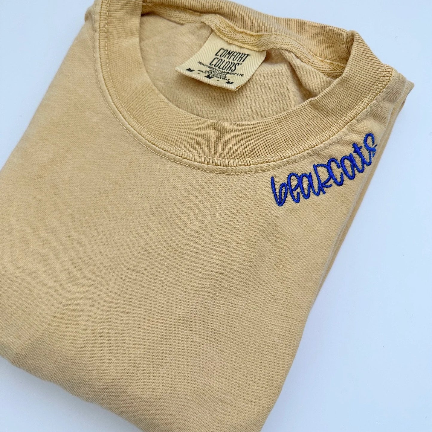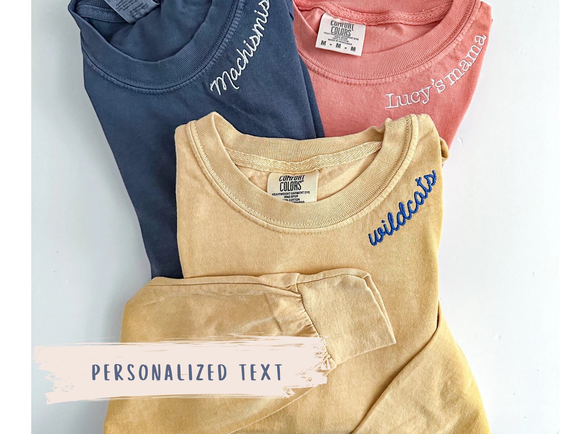 This Comfort Colors tee features your personalized text embroidered right along the neckline: subtle, sweet, and totally custom for you!