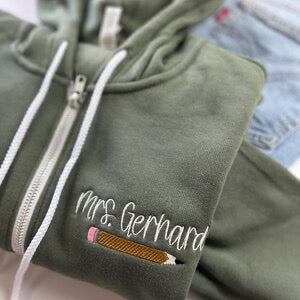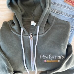 This zip up hoodie features your name stitched next to a mini pencil: subtle, c uteand perfect for teachers, aides, or other school staff!