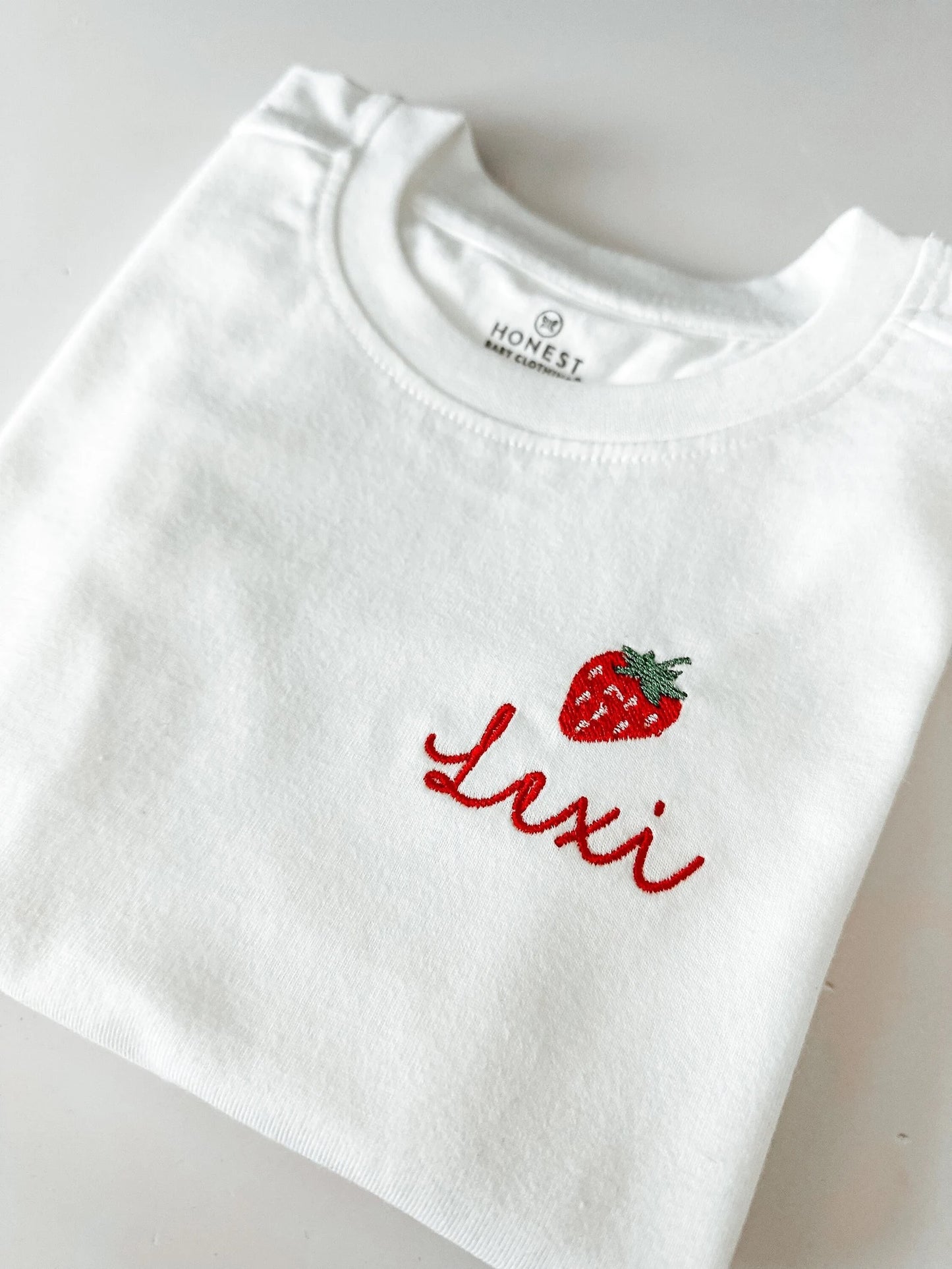 Simple, sweet, and personalized. Your little one will love this comfy white tee embroidered with their name below the cutest little strawberry! Perfect for everyday wear or a cute photo op!