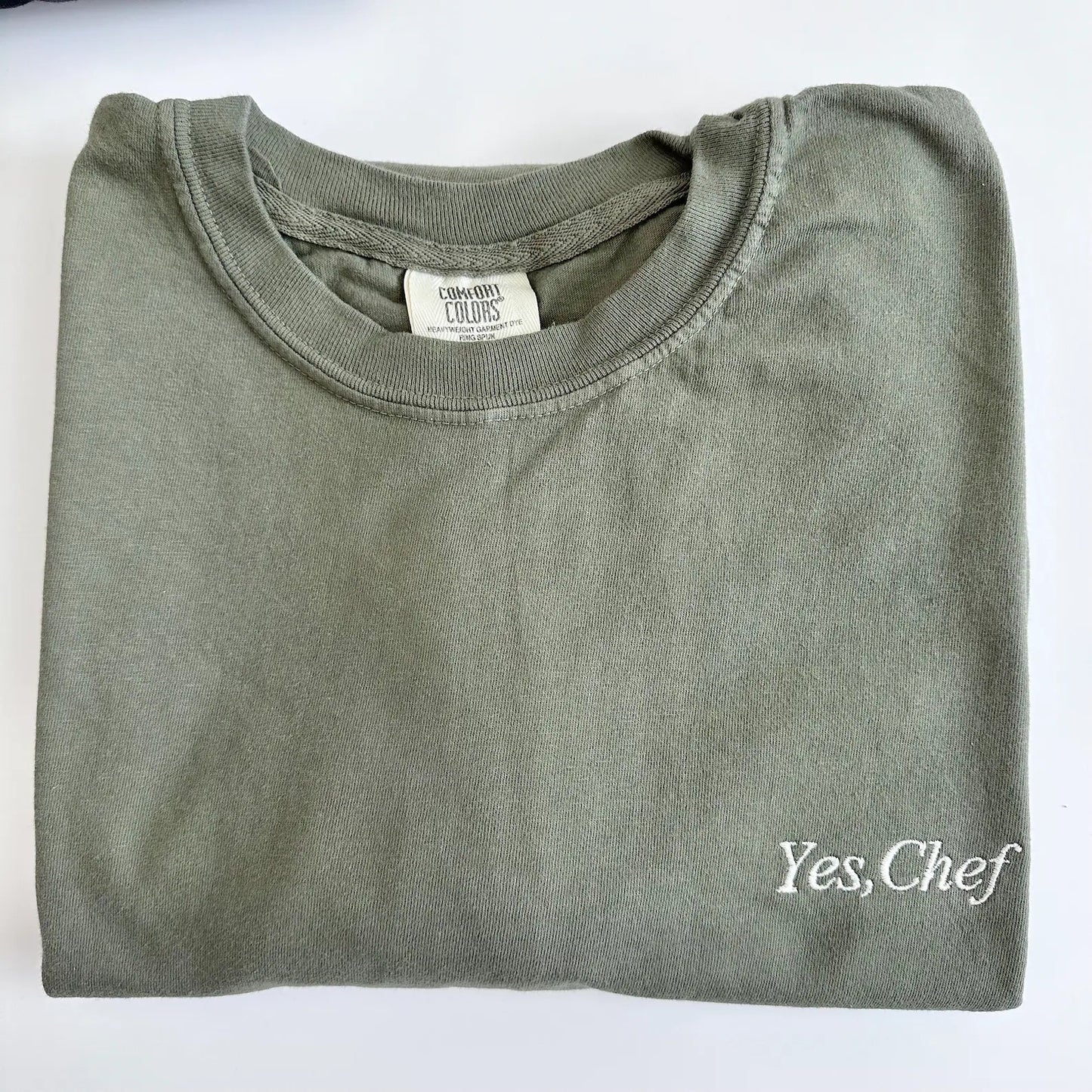 This minimalist embroidered tee features “Yes, Chef” stitched on the lower left chest: subtle, stylish, and made for kitchen queens, culinary kings, and fans of the chaos.