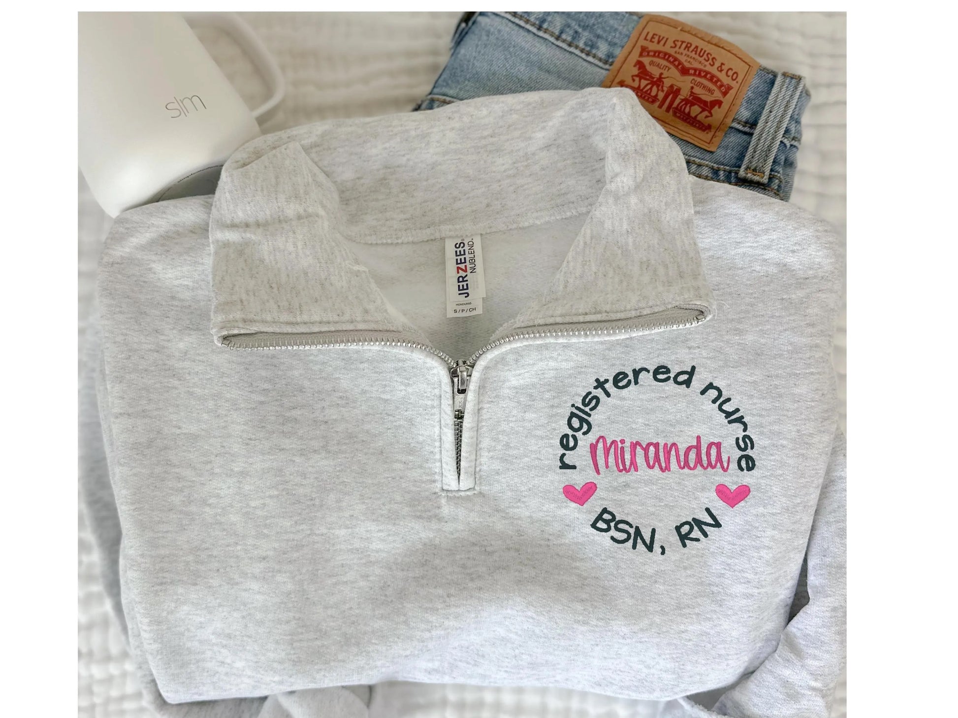 A personalized sweatshirt for our nurses. This embroidered quarter zip features a custom name and credentials for a clean, professional look that transitions easily from work to everyday wear. Professionally embroidered in house and made to order, as always!