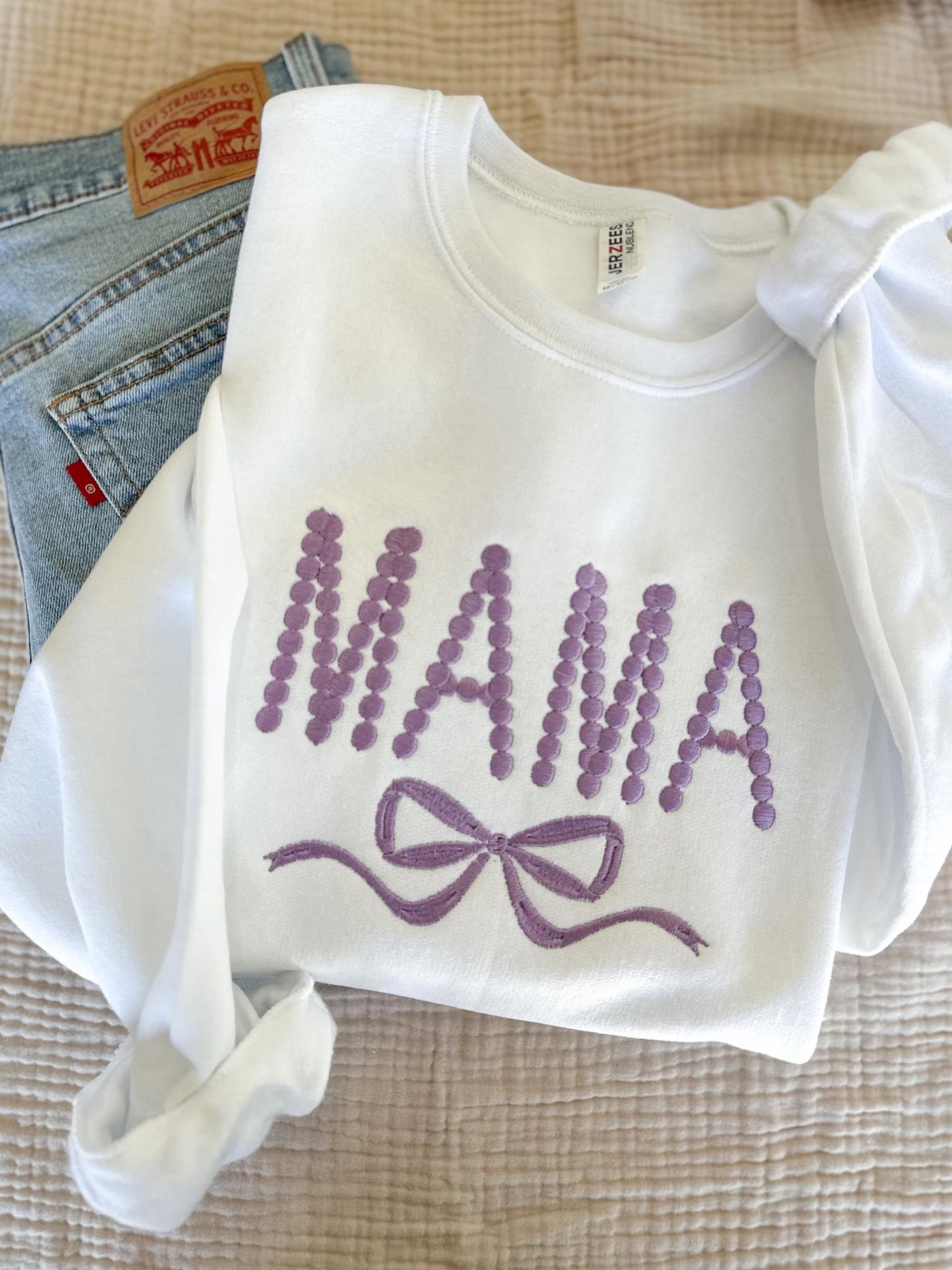 Make it girly and make it MAMA! This adorable white sweatshirt features playful pearl lettering and a dainty bow underneath!