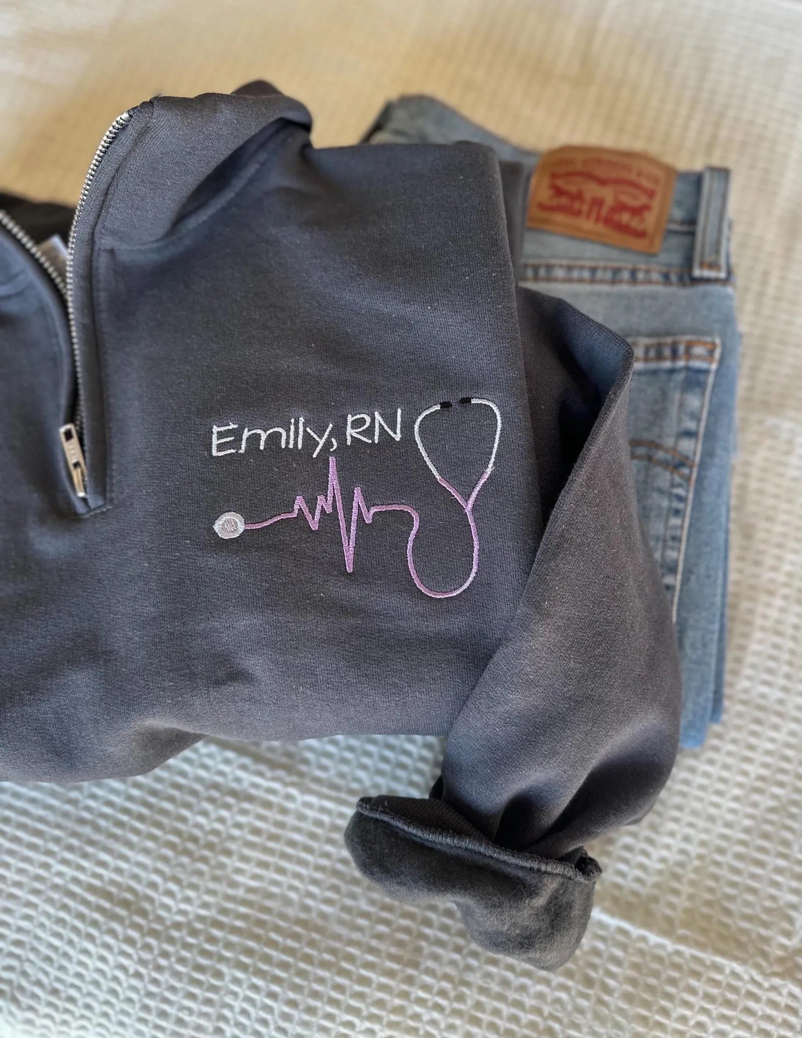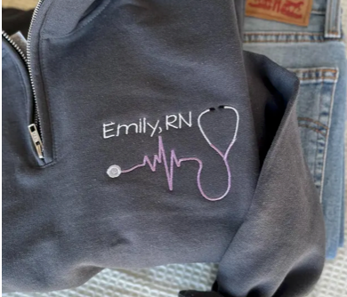 This RN zip up features a heartbeat line + stethoscope design, personalized with your name. A great everyday piece for nurses on the move.