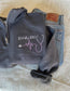 Shown in charcoal with lavender + white thread