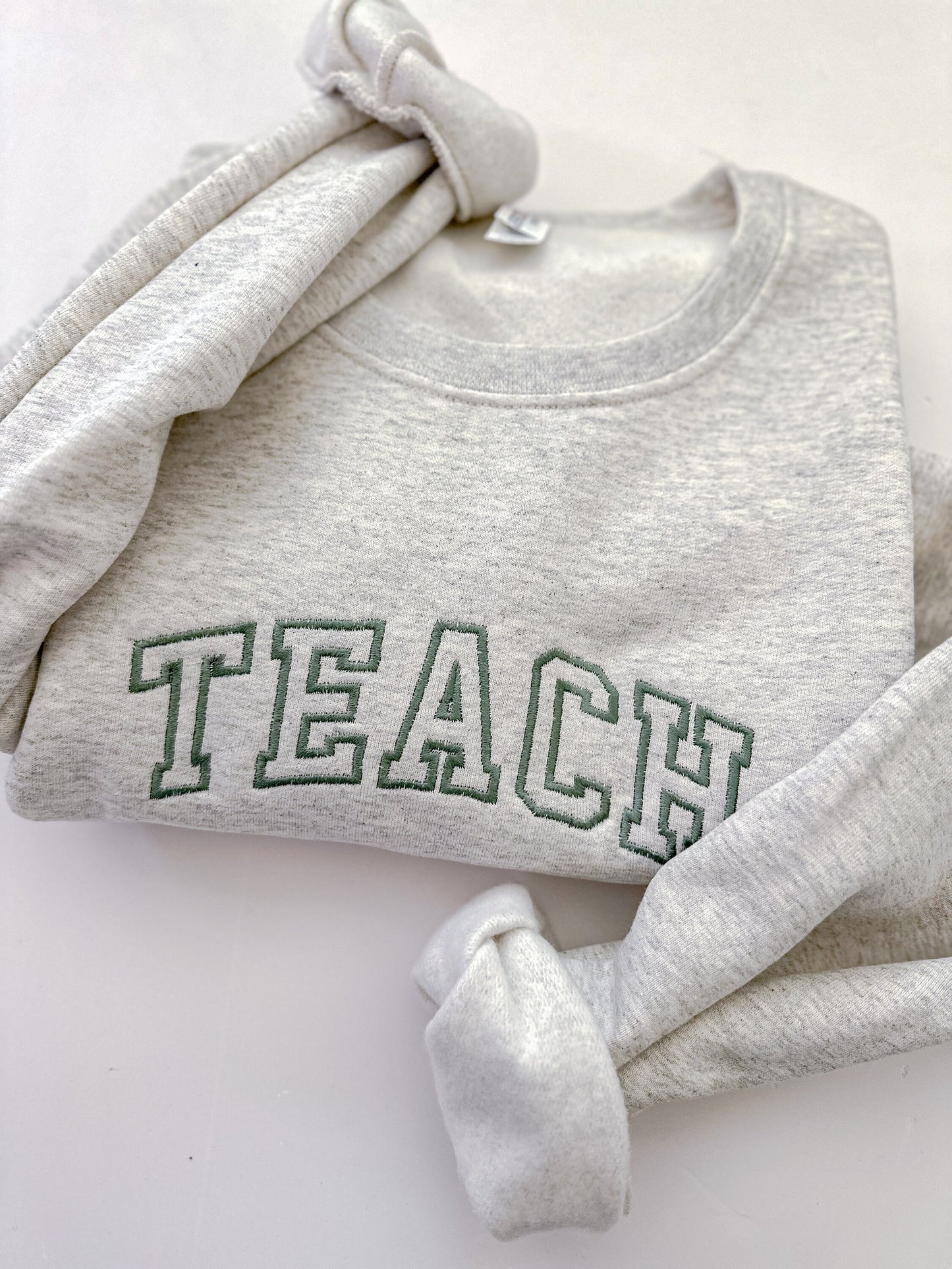 This cozy crewneck sweatshirt is the perfect everyday layer for teachers who want to show off their cute teacher style. This piece features the word “TEACH” embroidered in a collegiate-style font with your choice of thread color.