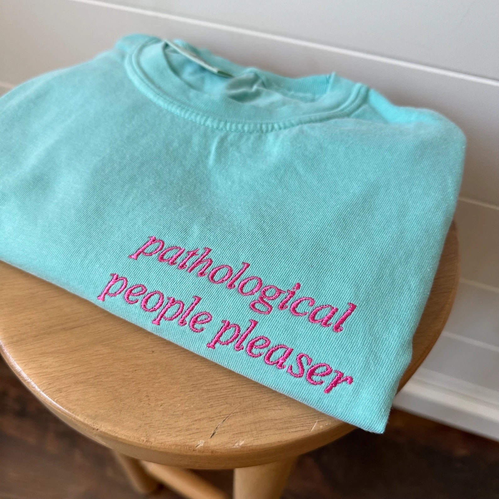 For the girls who say yes a little too often š This fun tee says what weāre all thinking: āpathological people pleaserā in simple times font. A cute and cheeky gift for your favorite people pleaser.