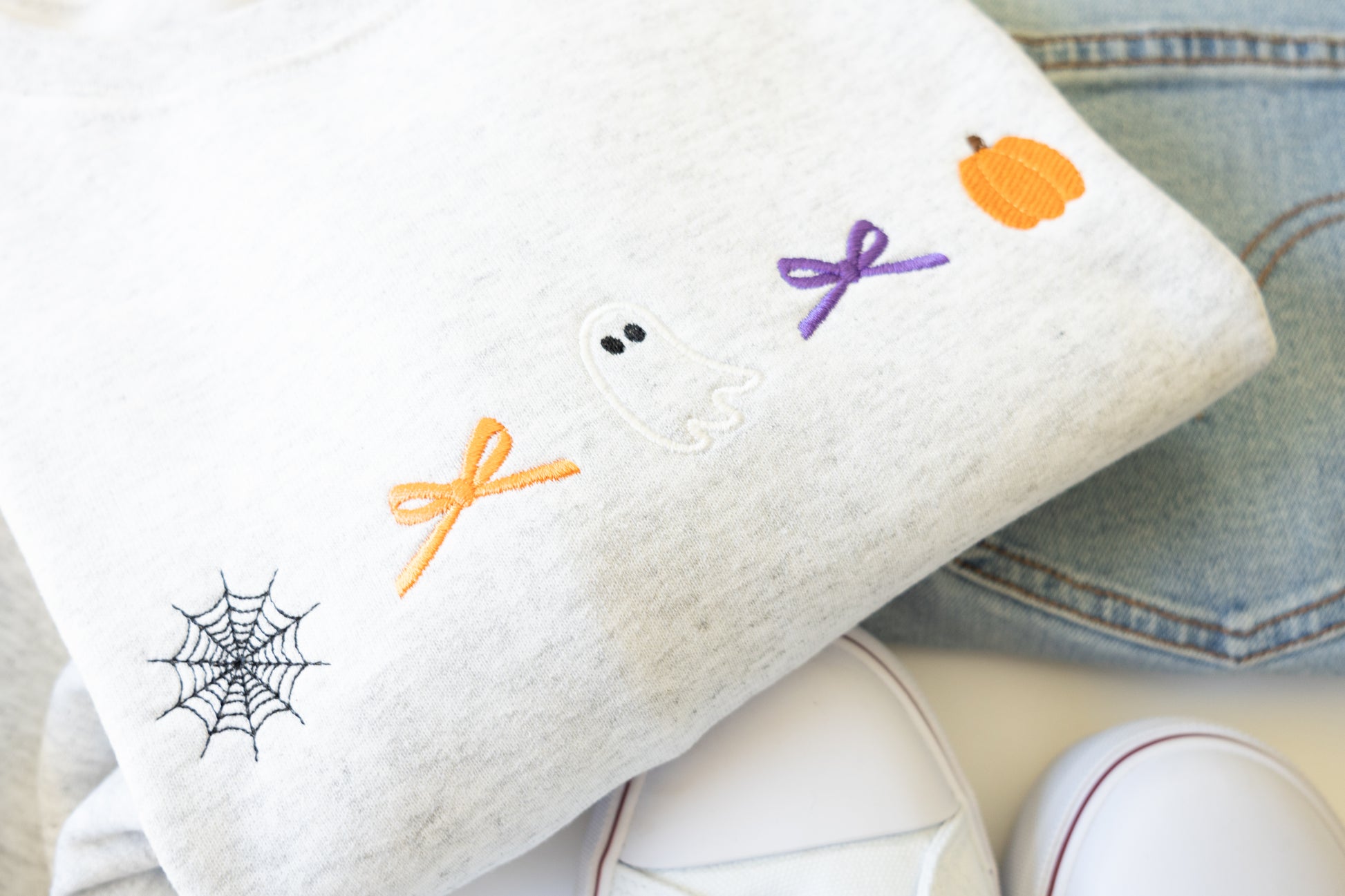Mini spooky vibes 👻 This comfy crew sweatshirt features a lineup of Halloween icons, spider web, bows, ghost, and pumpkin...all embroidered for lasting cuteness.