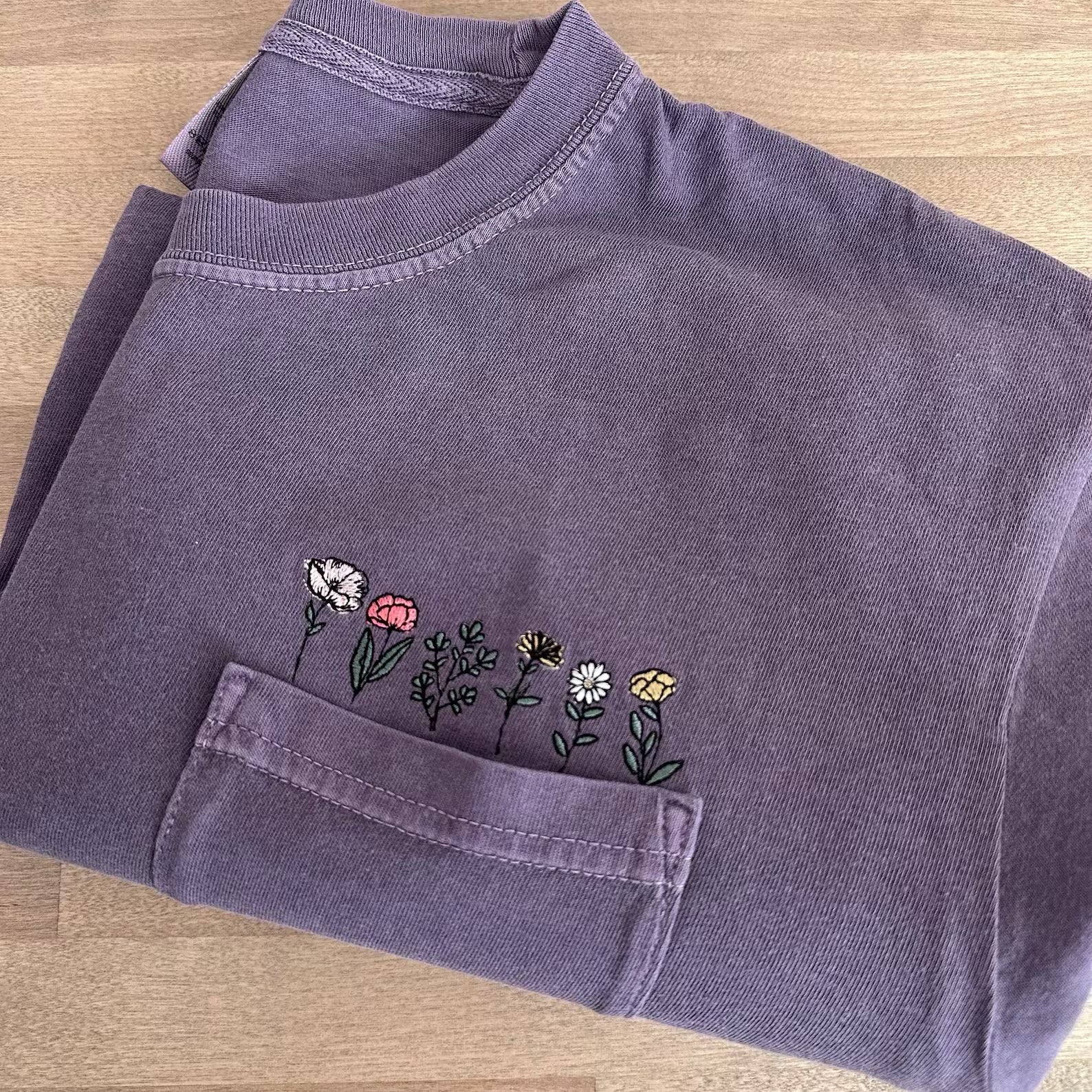 Bring the charm of wildflowers wherever you go. This Comfort Colors pocket tee features a colorful line of hand drawn style embroidered blooms peeking out of the pocket.