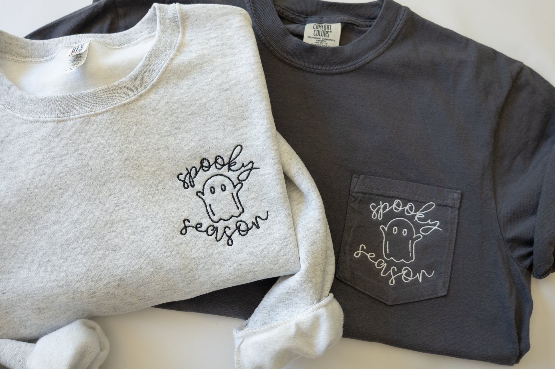 Keep it casual with a spooky twist đ» This pocket tee features a cute ghost and âspooky seasonâ embroidered in script on the chest pocket the perfect low-key nod to Halloween. Please note, the pocket is stitched closed.