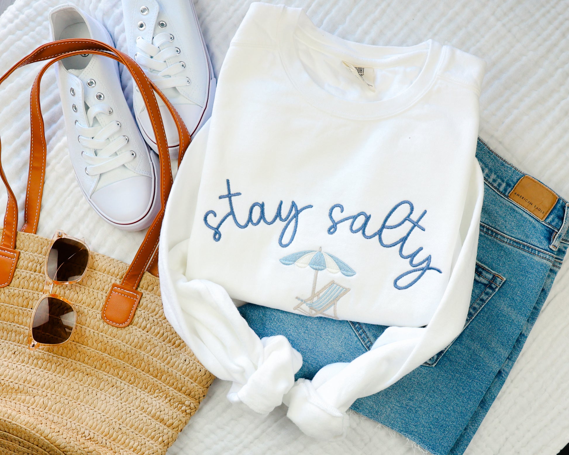 Inspired by Matthew 5:13, this soft white crewneck features “stay salty” embroidered in rich blue palette. It’s the perfect blend of coastal style and faith! Ideal for beach days, Bible study nights, coffee runs, or relaxed Sundays.