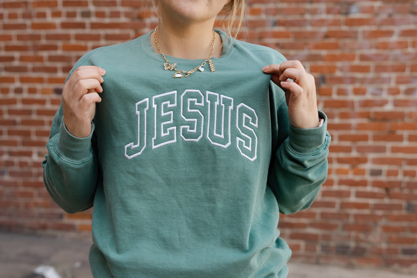 A bold reminder of faith you can wear every day. This cozy crewneck sweatshirt features the word "JESUS" in varsity block style embroidery across the front.