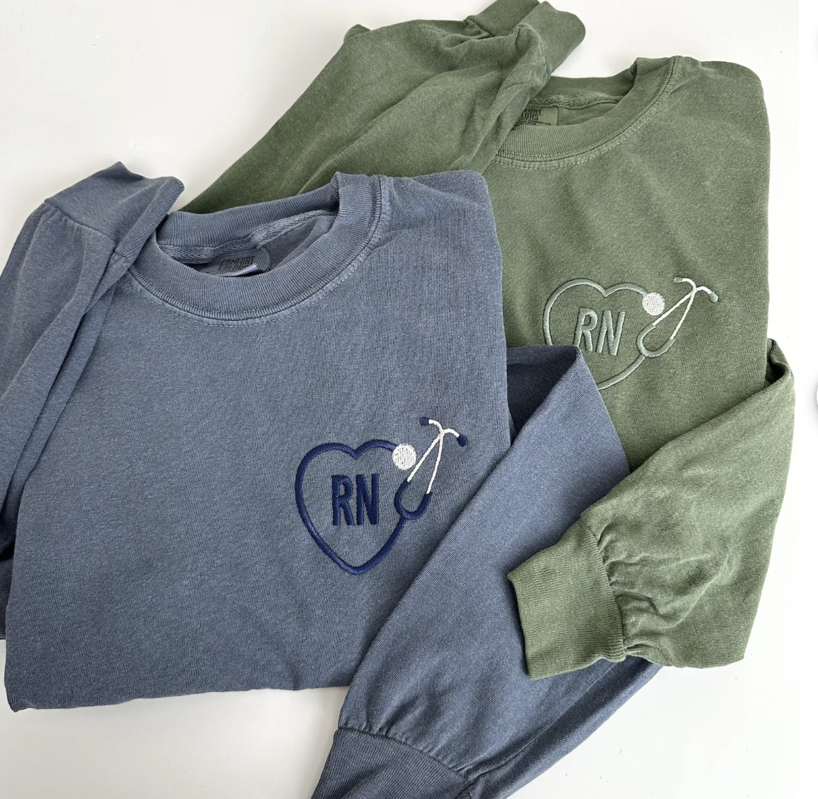 A comfy crew with clean RN embroidery inside a heart + stethoscope design. Subtle and stylish for nurses who love their job, on the clock and off!