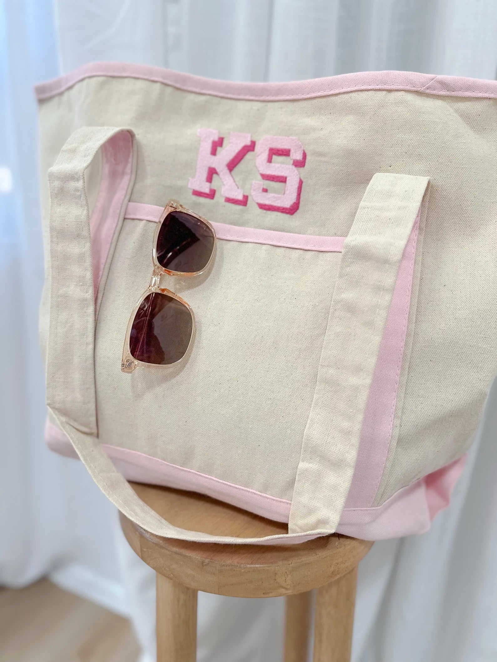 This canvas tote is giving preppy, sporty, and totally personalized with bold shadow varsity initials. Ā Whether youāre headed to the pool, the farmerās market, or packing up for a girlsā weekend, this oneās your new go to!