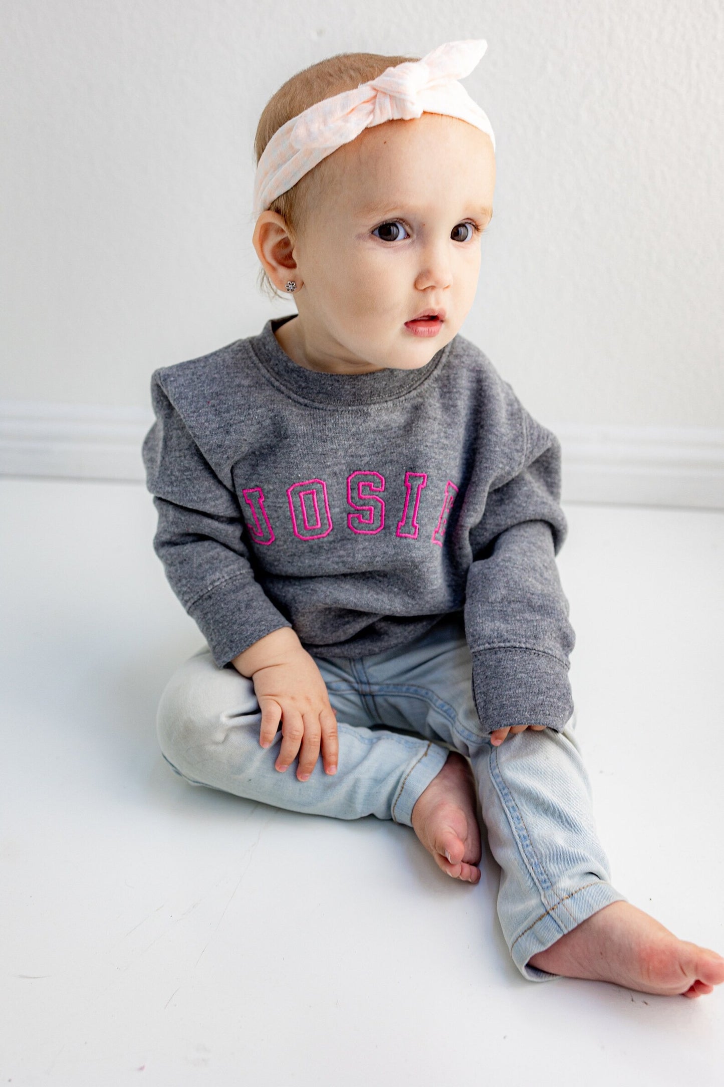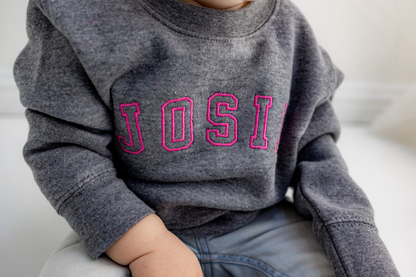 Our custom varsity crew lets you choose your custom thread color, and name to create a one of a kind piece your little one will love! Whether it’s their name, nickname, this sweatshirt is all about them.