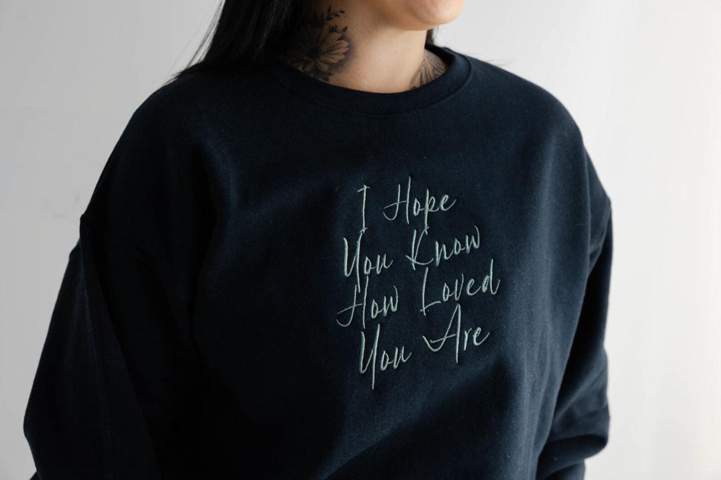 This minimalist embroidered sweatshirt says “I Hope You Know How Loved You Are” in a delicate script font. Perfect for gifting or wrapping yourself in words that matter.