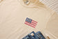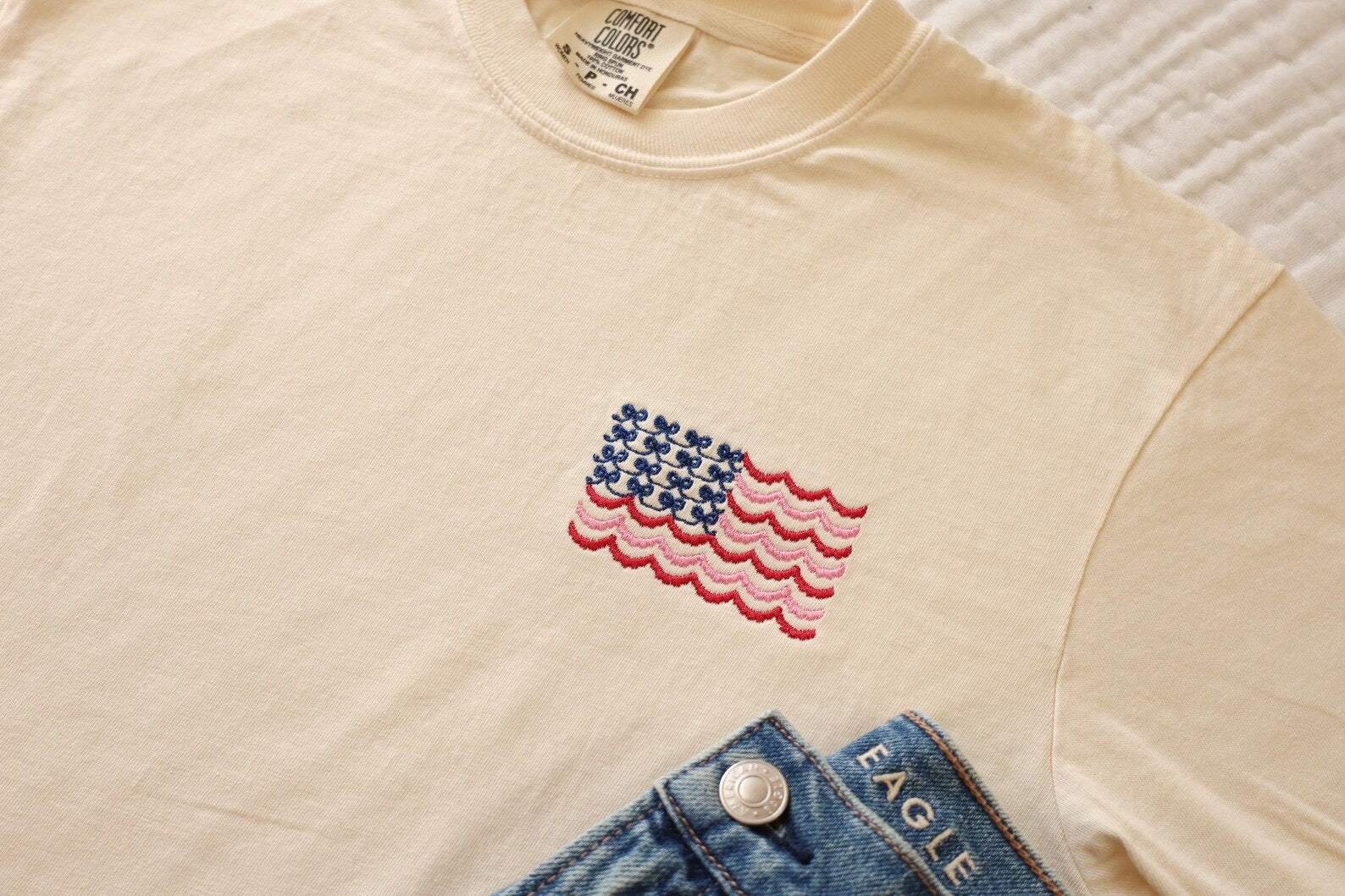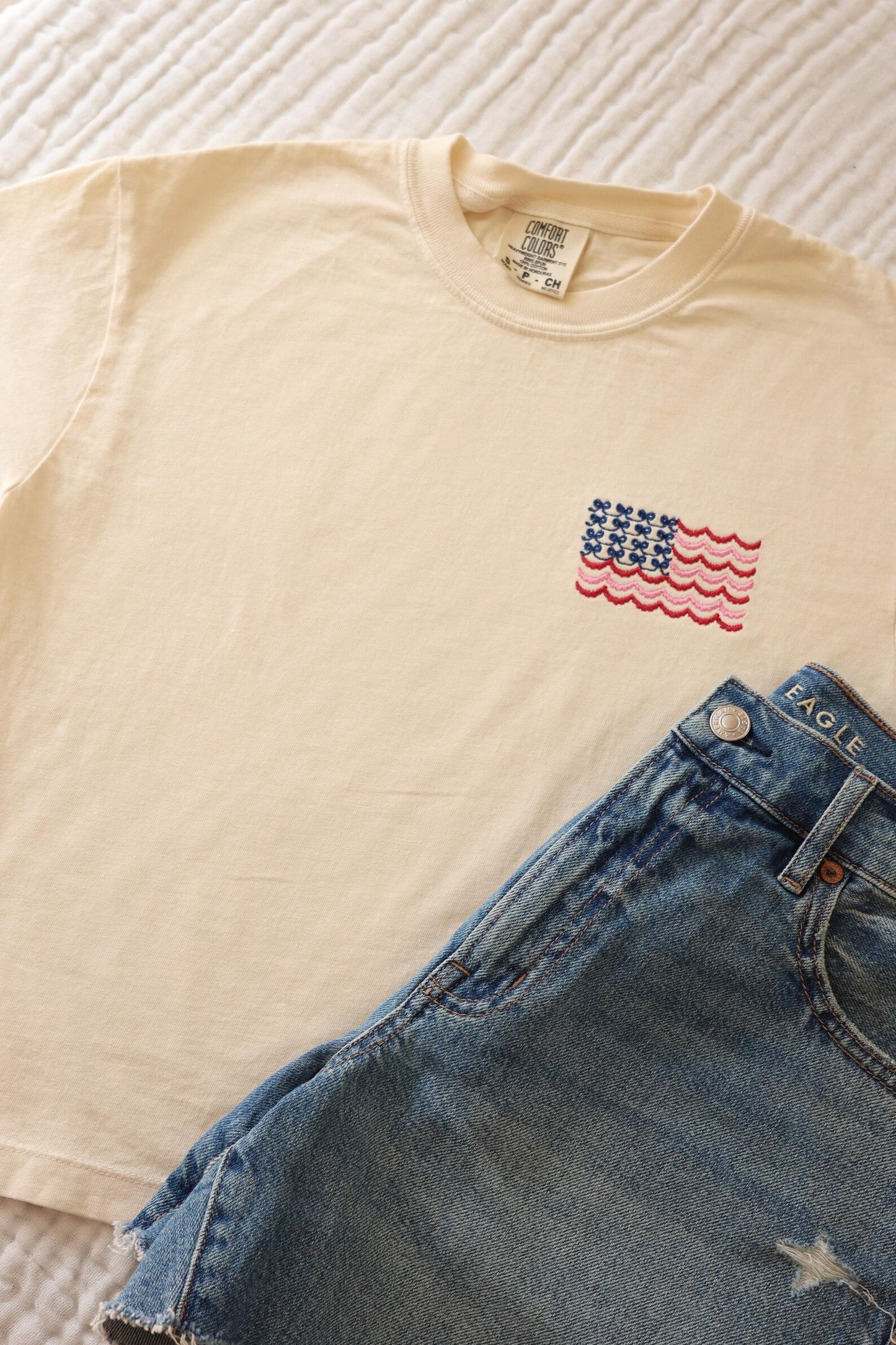 This one’s for the girly firls who love a classic look with a feminine twist! Our embroidered flag tee features a red + pink scalloped flag stitched with mini bows in the stars.