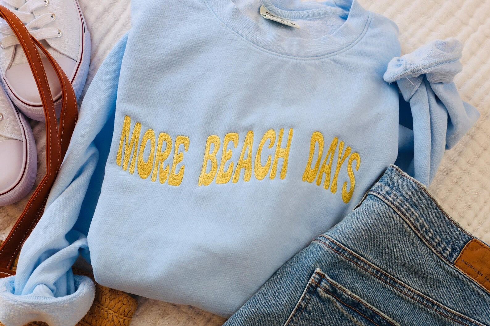 Manifest those sunny days with this fun More Beach Days sweatshirt. Embroidered in any of our thread color on a soft lightweight crewneck for the ultimate coastal vibes. Made to order in our CA warehouse with premium threads and care.
