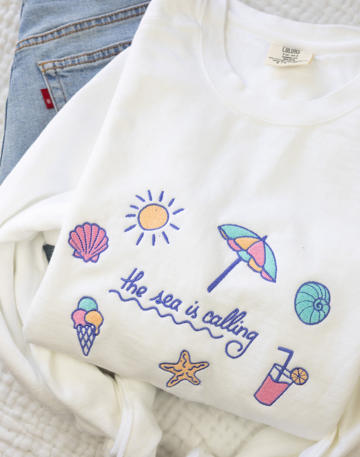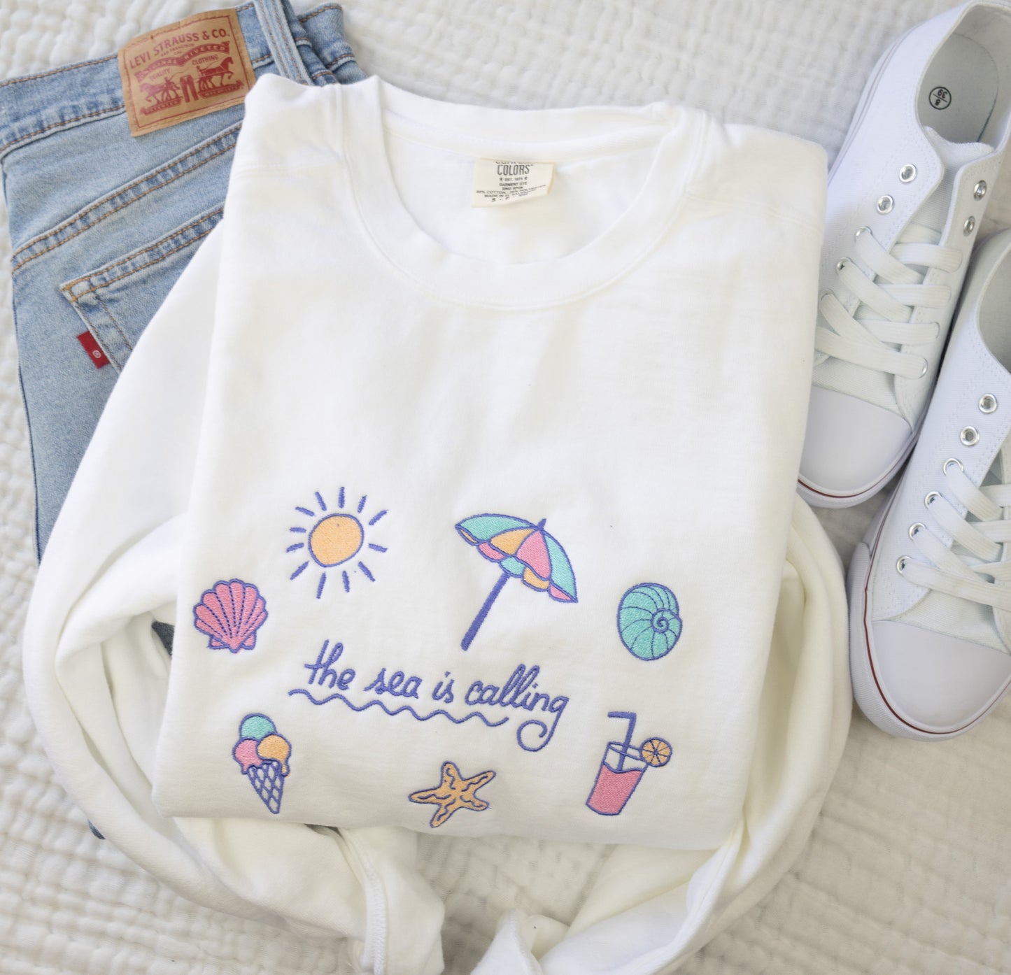 Stay cozy + cute while dreaming of beach days! This embroidered comfort colors crewneck sweatshirt features all the beachy icons in a soft summer palette.